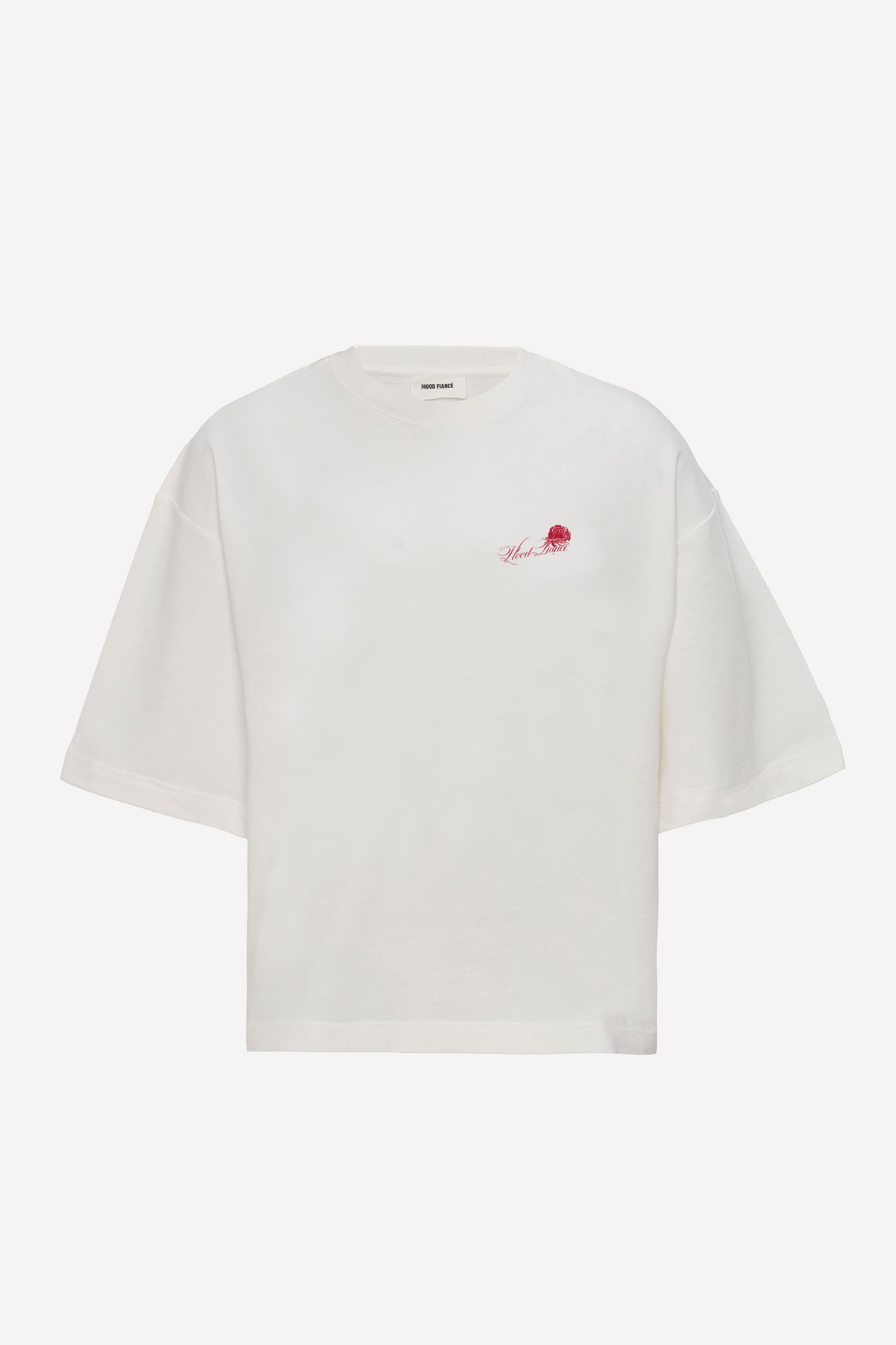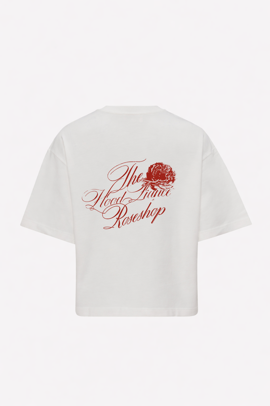 Our Roseshop Tee features a boxy fit that provides the perfect length, with extended sleeves to emphasize the boxiness. The collar is adjusted to match the fit and is therefore wider than typical T-shirts. The fabric is made of 2-ply 100% cotton, offering a very smooth texture that makes it breathable and comfortable to wear.